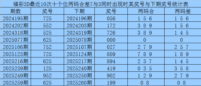 十个位合差分析:上期奖号十个位开出52组合,两码合为7,两码差为3,最近10次十个位两码合7与两码差3同期出面前,其奖号和下期奖号分袂为: