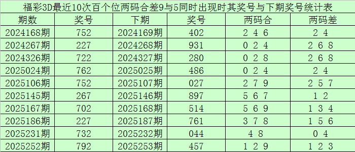 百个位合差分析:上期奖号百个位开出72组合,两码合为9,两码差为5,最近10次百个位两码合9与两码差5同期出面前,其奖号和下期奖号分袂为: