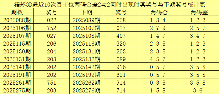 从以上统计不错看出,百十位两码合差2与2同期出现之后其下期两码合差发达最热的4个分袂为:1235,本期百十位两码合差不错参考这四码中的数据。